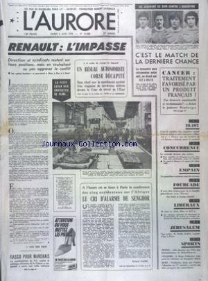Descriptions AURORE (L') [No 10488] du 06/06/1978 - RENAULT - L'IMPASSE - UN RESEAU AUTONOMISTE CORSE DECAPITE - CANCER - TRAITREMENT FAVORISE PAR UN PRODUIT FRANCAIS - LE CRI D'ALARME DE SENGHOR - FIASCO POUR MARCHAIS - LES SPORTS - TENNIS - CYCLISME - BOXE - EMPAIN - UN 4EME RAVISSEUR SOUS LES VERROU - JERUSALEM - SON MAIRE - TEDDY KOLLEK - A PARIS livre