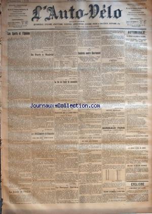 AUTO VELO (L') [No 557] du 24/04/1902 - LES SPORTS ET L'OPINION PAR JEAN HUBERT-FILLAY - LA SOIREE DE L'A.C.F. PAR GEORGES PRADE - DE PARIS A MADRID PAR H. DESGRANGE - LES 100 KILOMETRES DE DIMANCHE - ELKES, ROBL, CHASE, LINTON ET TAYLOR PAR GEO LEFEVRE - LE ROI DE L'ACIER EN AUTOMOBILE PAR G. P. - MARSEILLE-PARIS - LES 18 ET 19 MAI 1902 - (PREMIERE ANNEE) ORGANISEE PAR L'AUTO-VELO - L'HEURE DU DEPART - LE CONTROLE DE SENS - LE BANQUET DARRACQ PAR FAFLOTTE - BOXE - CAS Info
