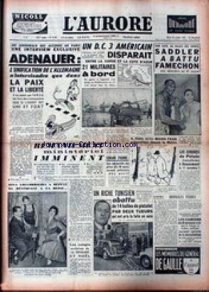 AURORE (L') [No 3149] du 26/10/1954 - ADENAUER - L'INIFICATION DE L'ALLEMAGNE N'INTERVIENDRA QUE DANS LA PAIX ET LA LIBERTE - UN D.C. 3 AMERICAIN DISPARAIT - SADDLER A BATTU FAMECHON - BOXE - GINA LOLLOBRIGIDA. La revue