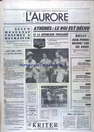 Descriptions AURORE (L') [No 8943] du 02/06/1973 - ATHENES - LE ROI EST CONSTANTIN DECHU ET LA REPUBLIQUE PROCLAMEE - AUCUN RESULTAT CONCRET A REYKJAVIK - BRUAY - JEAN-PIERRE REVIENT SUR SES AVEUX - LES SPORTS - TENNIS - BOXE - AUTO Télécharger