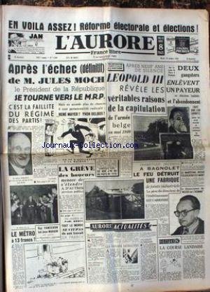 AURORE (L') [No 1586] du 18/10/1949 - APRES L'ECHEC DE JULES MOCH - LE PRESIDENT SE TOURNE VERS LE M.R.P. - MAYER OU DELBOS - LEOPOLD III REVELE LES VERITABLES RAISONS DE LA CAPITULATION DE L'ARMEE BELGE EN MAI 40 - RAY FAMECHON BAT JEAN MOUGIN - BOXE - LE MARECHAL RUSSE TOLBOUKINE EST MORT. Description