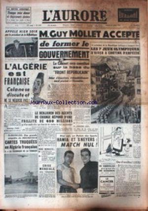 AURORE (L') [No 3541] du 27/01/1956 - M. GUY MOLLET ACCEPTE DE FORMER LE GOUVERNEMENT - L'ALGERIE EST FRANCASE CELA NE SE DISCUTE PAS - LES 7EME JEUX OLYMPIQUES D'HIVER A CORTINA D'AMPEZZO - HAMIA ET SNEYERS - MATCH NUL. Info