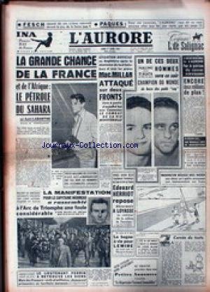 AURORE (L') du 01/04/1957 - LE PETROLE DU SAHARA - MAC MILLAN SUR DEUX FRONTS - HALIMI CONTRE D'AGATA - CHAMPIONNAT DU MONDE DE BOXE - MANIFESTATION POUR LE CAPITAINE MOUREAU - EDOUARD HERRIOT LE BAGNE A VIE POUR LEMIRE. Description