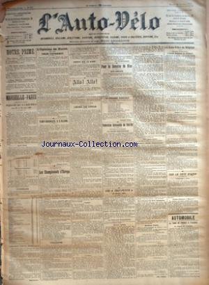 .NOTRE PRIME - MARSEILLE-PARIS - (DEUXIEME ANNEE) - ORGANISEE PAR +ŒL'AUTO-VELO+« - LES 18 ET 19 MAI 1902 - AUX PRIX - L'ITINERAIRE - QUELQUES POINTS IMPORTANTS - SAINT-VALLIER - L'OPINION DE HURET SUR LES TANDEMS D'ENTRAINEMENT PAR GEO LEFEVRE - PARIS-BORDEAUX A L'ALCOOL PAR GEORGES PRADE - A DA VOS-PLATZ - LES CHAMPIONNATS D'EUROPE - TOBOGGANING - HOCKEY SUR LA GLACE PAR PAUL DELAMARRE - ALLO ! ALLO ! - ENCORE UNE ERREUR - LE TELEPHONISTE - POUR LA SEMAINE DE NICE - NICE-ABBAZIA - LA CARAVANE PARIS-NICE PAR GEORGES PRADE - FEDERATION AUTOMOBILE DU SUD-EST - LA COUPE PROVINCIALE PAR LASSAGNE - LES +ŒTOUT-PETITS+« - 19 JANVIER 1902 - JEUDI 16 JANVIER A 8 HEURES DU SOIR - LES NOUVEAUX ENGAGEMENTS - EPREUVE CYCLISTE - EPREUVE PEDESTRE - 705 ENGAGEMENTS - QUELQUES DETAILS D'ORGANISATION - DES ECHARPES AUX DEUX CHAMPIONS - QUELQUES LETTRES GEO LEFEVRE - +ŒL'AUTO-VELO+« EN BELGIQUE - L'ALCOOL DENATURE EN BELGIQUE - LE SALON DE L'AUTOMOBILE DE BRUXELLES - OSTENDE-ARMENTIERES-PARIS - PETITES NOUVELLES - LA TAXE PROVINCIALE EN BELGIQUE PAR G. HULIN - SUR LA COTE D'AZUR - L'ESCRIME A NICE - SANTON-DUMONT A MONACO PAR JEAN NICARD - AUTOMOBILE - LE TOUR DE FRANCE A L'ALCOOL - LE DEPART DE CORMIER..
