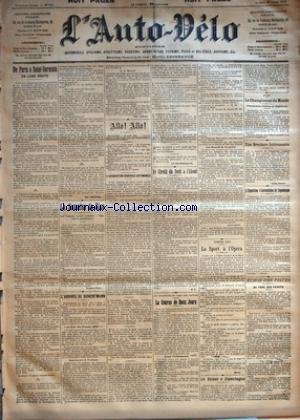 AUTO VELO (L') [No 545] du 12/04/1902 - DE PARIS A SAINT-GERMAIN EN LIGNE DROITE PAR GEO LEFEVRE - LA SEMAINE DE NICE PAR GEORGES PRADE - L'ARRIVEE DE DICKENTMANN PAR GEO LEFEVRE - ALLO ! ALLO ! - L'ASSOCIATION GENERALE AUTOMOBILE PAR H. DESGRANGE - LE TELEPHONISTE - LE CIRCUIT DU NORD A L'ALCOOL PAR S.-V. - AU VELODROME DU PARC DES PRINCES - LA COURSE DE DEUX JOURS PAR GEO LEFEVRE - CONTE GAI - LE SPORT A L'OPERA PAR MORRY - LA SAISON A COPENHAGUE PAR NIELSEN - BOXE - Info