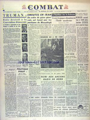 COMBAT [No 2503] du 21/07/1952 - TRUMAN - ROLE DECISIF A LA CONVENTION DEMOCRATE - EMEUTES EN IRAN - ORDRE DE GREVE LANCE PAR LES PARTISANS DE MOSSADEGH - LA REPUBLIQUE CHEZ LES BRAHMANES - 3 FEMMES DOMINENT L'INDE MODERNE PAR CHOISY - LES JEUX OLYMPIQUES - MIMOUN ET ZATOPEK - WEEK-END A DEAUVILLE - EMMANUEL BERL - ALIBI AUX ANCIENS NAZIS DE BONN - LA POLITIQUE PINAY La revue
