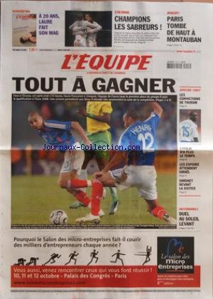 EQUIPE (L') [No 19092] du 07/10/2006 - A 20 ANS, LAURE FAIT SON MAG ESCRIME - CHAMPIONS LES SABREURS RUGBY - PARIS TOMBE DE HAUT A MONTAUBAN TOUT GAGNER SPECIAL FOOT - LES CONVICTIONS DE THURAM - L'ITALIE N'A PLUS LE TEMPS - LES ESPOIRS ATTENDENT ISRAEL - SIMONET DEVANT LA JUSTICE AUTOMOBILE - DUEL AU SOLEIL LEVANT. Info